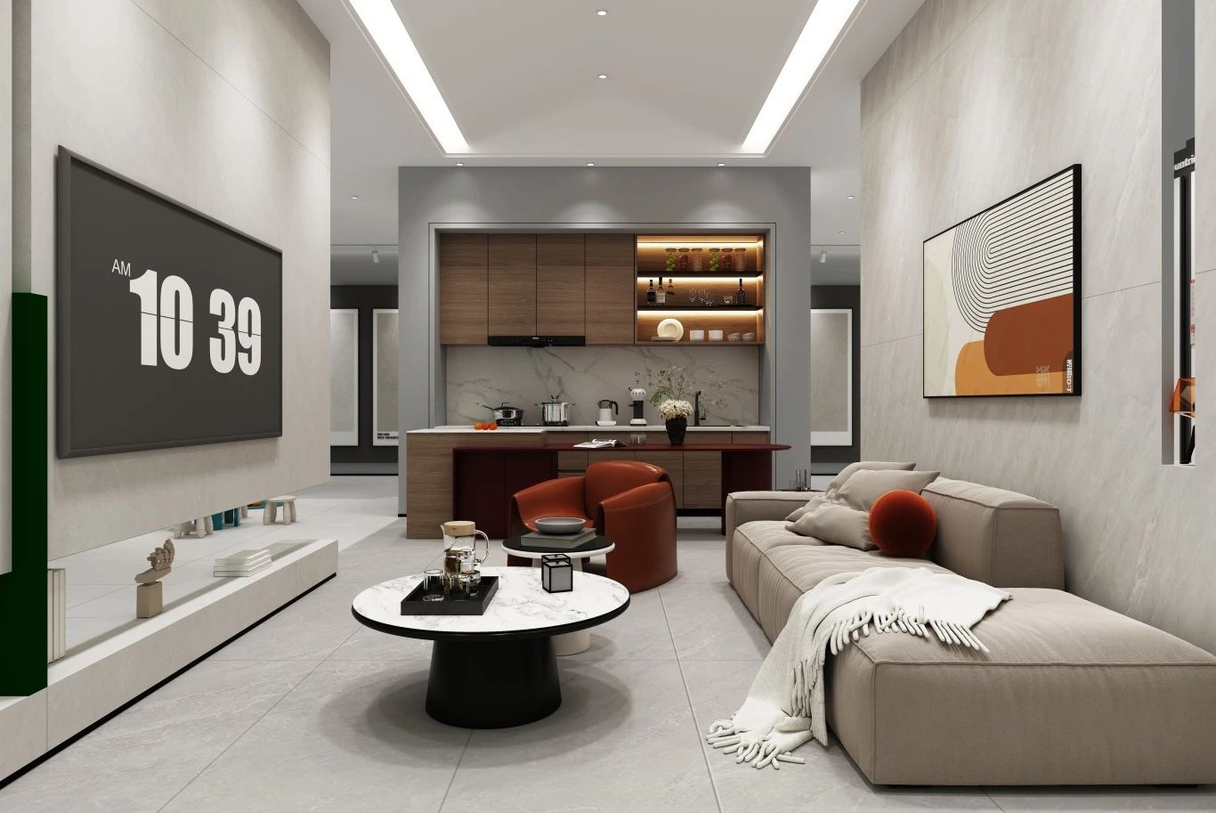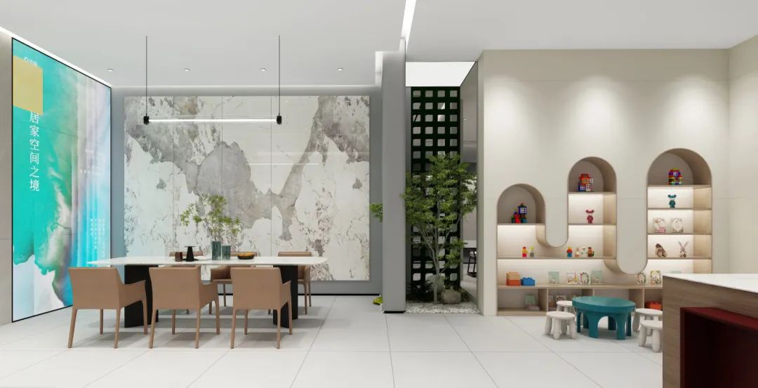 因而德田陶瓷以設(shè)計(jì)驅(qū)動(dòng),采用場景化體驗(yàn)展示方式,呈現(xiàn)出完整的客廳、臥室、餐廳、廚衛(wèi)等整體空間的產(chǎn)品應(yīng)用方式,直觀地帶給用戶具象化的應(yīng)用效果。